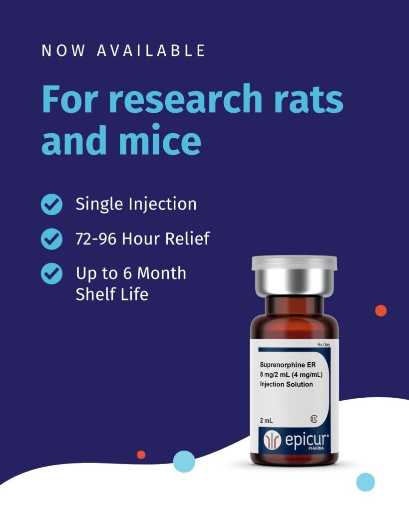 Epicur’s new Buprenorphine ER, specifically developed for research rats and mice, is now available and ready to ship. Buprenorphine ER is a long-acting analgesic, providing 72+ hours of advanced pain relief for lab rodents.